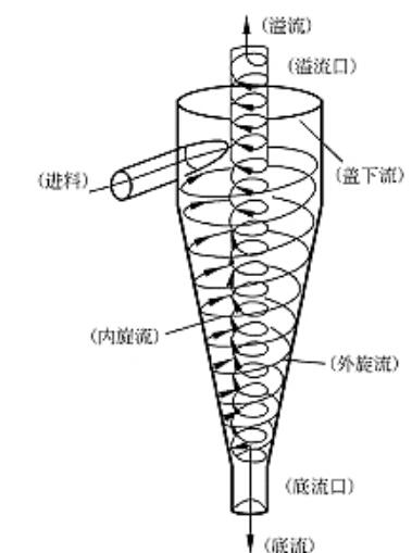 旋流器是一個帶有圓柱的錐形容器,椎體上部分叫液腔,液腔外側有一進液管,進液管以圓錐進液方向和液腔聯通。旋流器的頂端是上溢流口,底部是底流口,也叫排料口;旋流器內部有一個空心的圓管沿旋流器軸線從頂部延伸至液腔里,這個圓管叫溢流管,也叫旋流定向器,其內部形成上溢流通道以便泥漿向上溢流排除;旋流器的尺寸由椎體的最大內徑決定。
