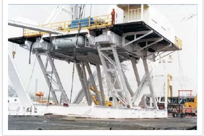 井架和底座用來支撐和安裝各鉆井設備和工具、提供鉆井操作場所。井架用來安裝天車、懸掛游車、大鉤、水龍頭和鉆具,承受鉆井工作載荷,排放立根;底座用來安裝動力機組、絞車、轉盤、支撐井架,借助轉盤懸持鉆具,提供轉盤和地面之間的高度空間,以安裝必要的防噴器和便于泥漿循環(huán)。