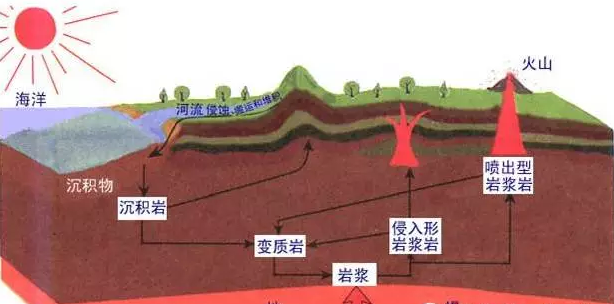 巖漿由地殼深處向淺處活動(dòng)的過程稱侵入作用,在這一階段冷凝固結(jié)形成的巖石叫侵入巖。巖漿沿裂隙溢出地表或噴向天空的活動(dòng)過程叫巖漿噴發(fā)或火山活動(dòng),這一階段冷凝固結(jié)形成的巖石叫噴出巖或火山巖。